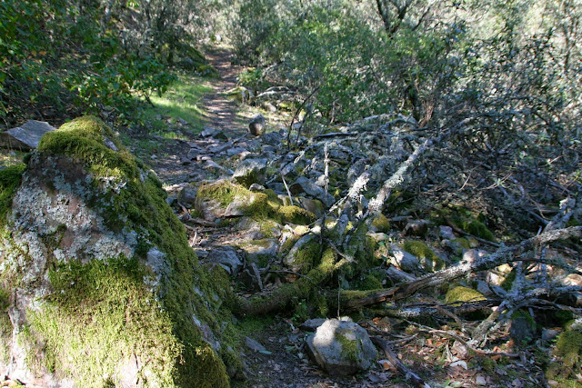 En una bifurcación se puede seguir adelante, o ya tomar la parte alta de esas montañas, donde el camino pasa a ser llano, pero plagado de jaras dejando intuir el camino. En ese momento todavía estaban por florecer, ahora ha de ser espectacular.
